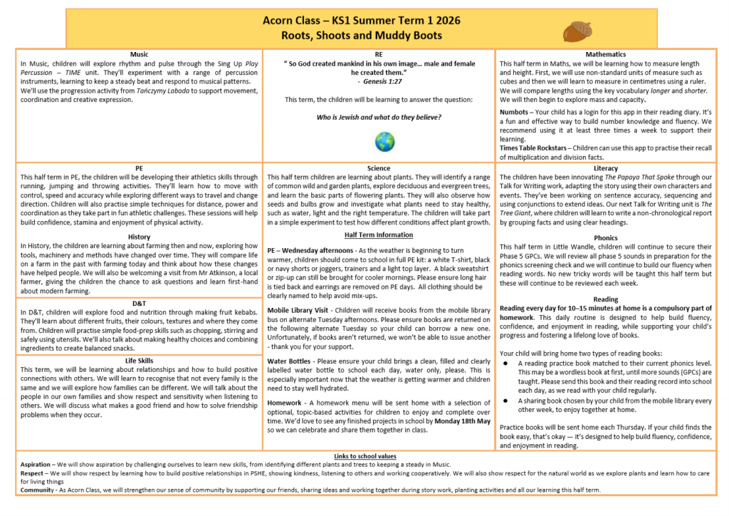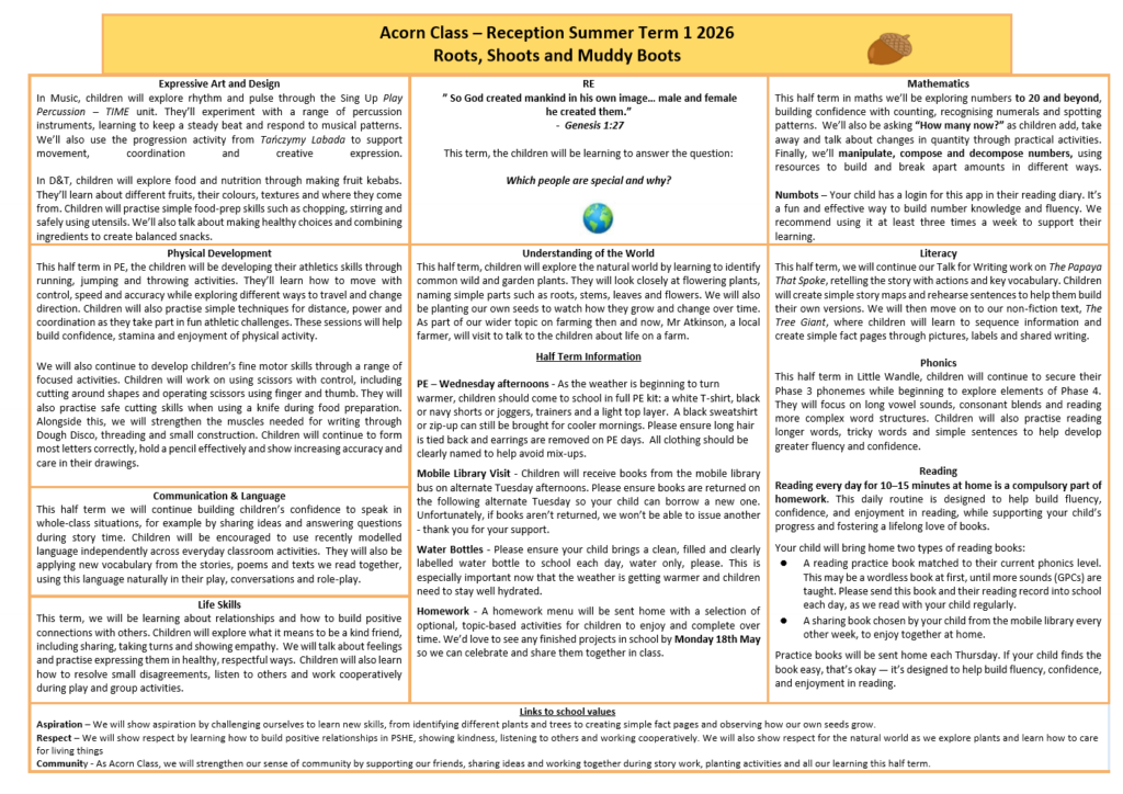 Acorn Class News, General, Newsletters Acorn Class Letters – Summer 1 2026 17 April 26 EYFS KS1 Click for a larger .pdf version! You can read more about our class on the Acorn Class page.